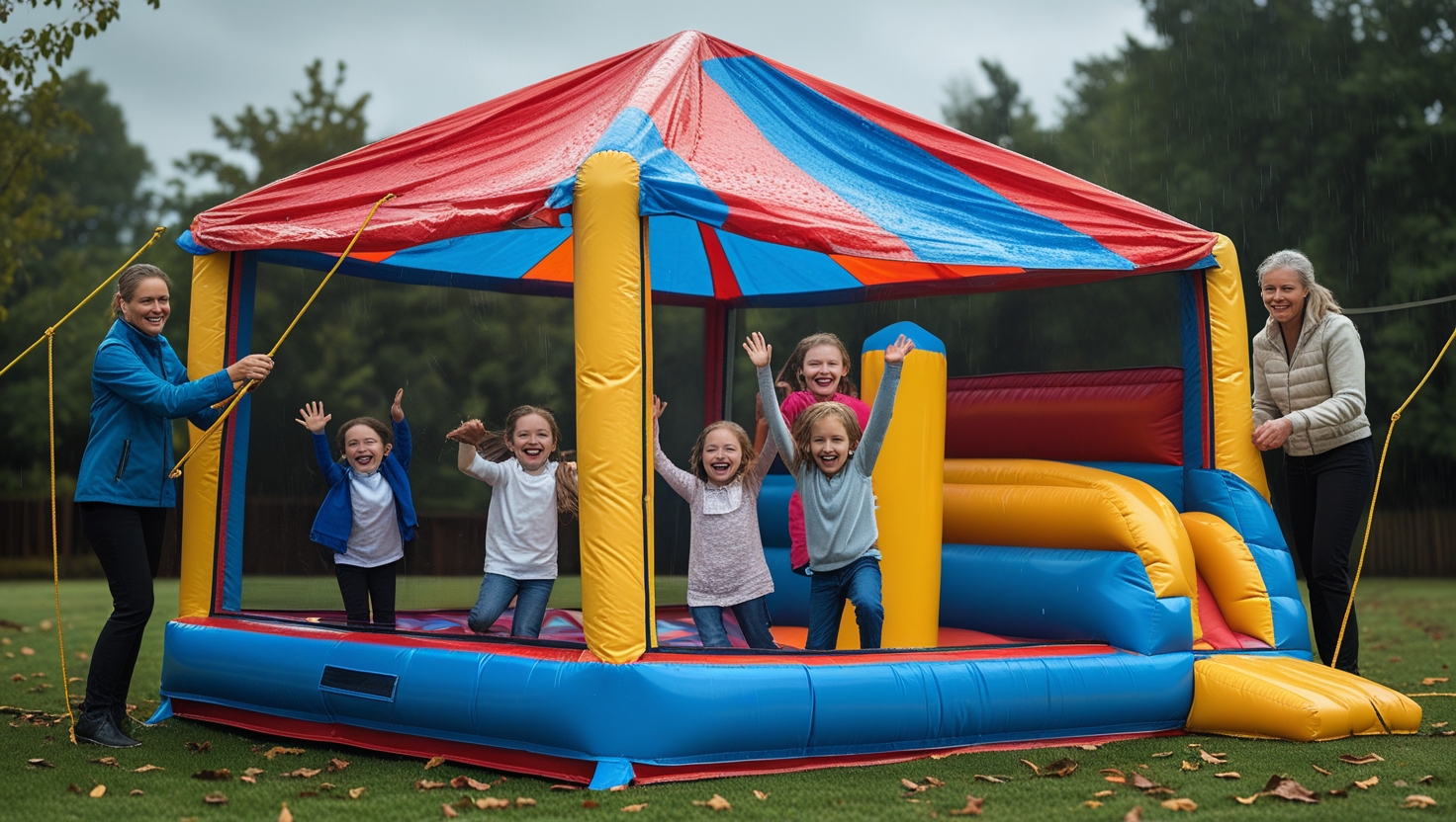 If an indoor venue is not available, consider erecting a temporary rain shelter over the bouncy castle. Ensure the shelter is large enough to cover the entire structure and sturdy enough to withstand moderate wind and rain.