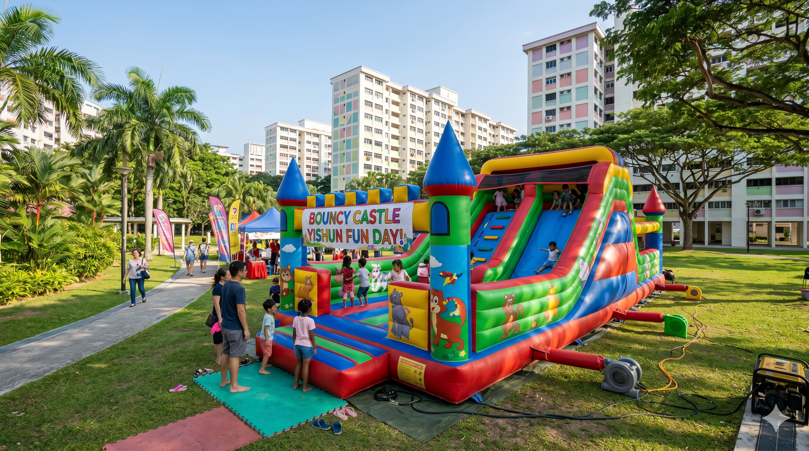 For sprawling outdoor celebrations, places like Yishun Park provide a beautiful, natural backdrop. When setting up on grass, we utilize industrial-grade steel stakes driven deep into the ground to provide maximum anchoring stability against unpredictable wind gusts. If access to a direct electrical outlet is unavailable in these outdoor settings, we provide powerful, whisper-quiet petrol generators to ensure your bouncy castle blower operates continuously and reliably throughout the duration of your event.
